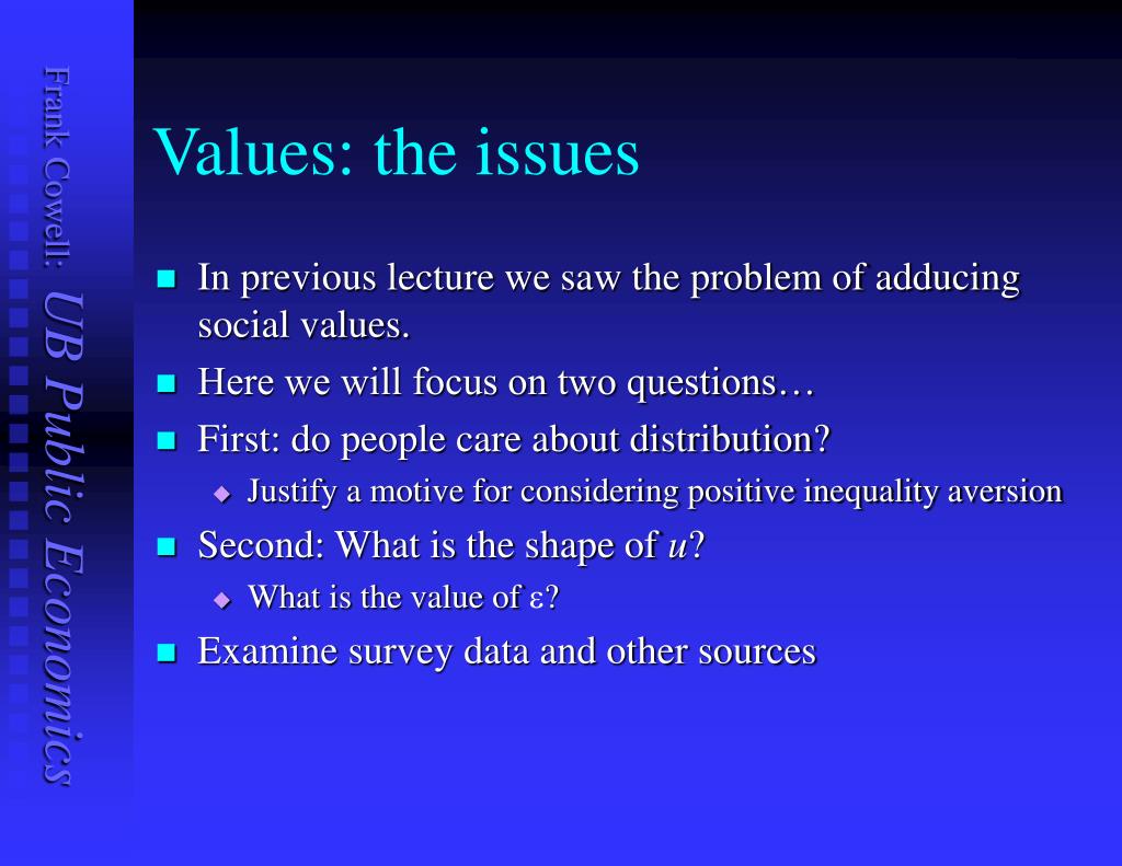 Values: the issues • In previous lecture we saw the problem of adducing social values. • Here we will focus on two questions… • First: do people care about distribution? • Justify a motive for considering positive inequality aversion • Second: What is the shape of u? • What is the value of e? • Examine survey data and other sources