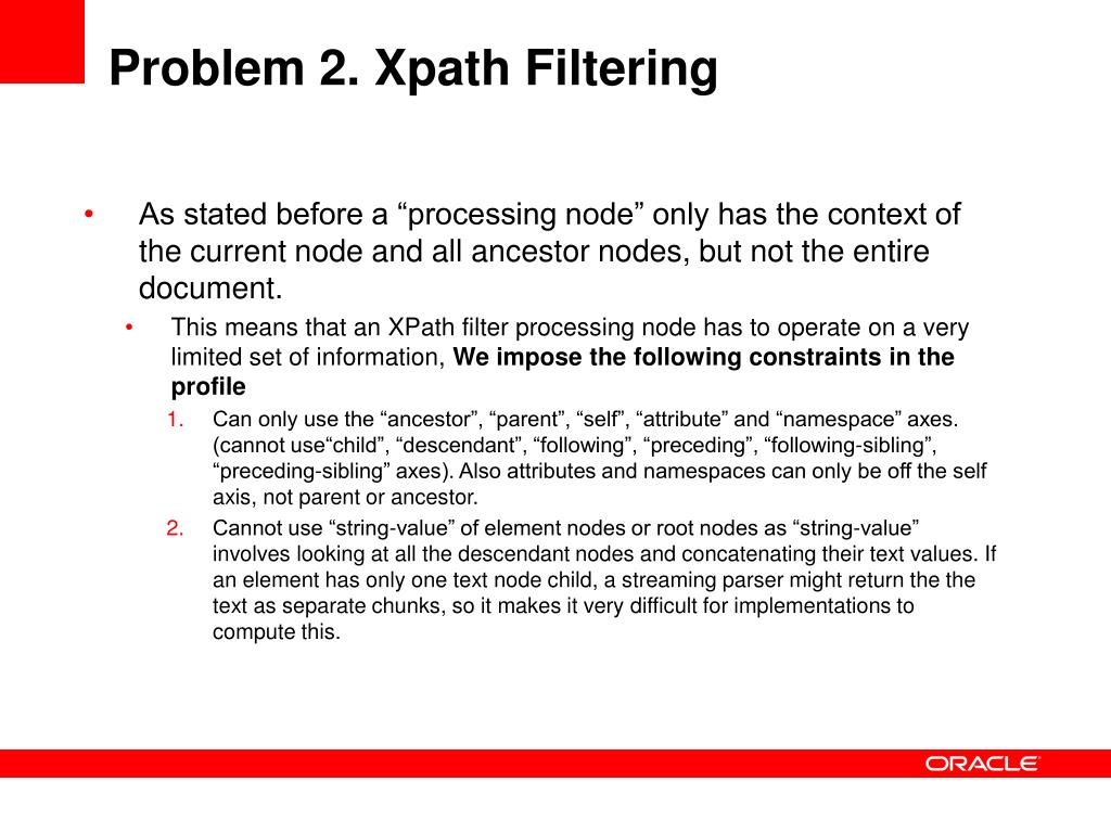 Problem 2. Xpath Filtering • As stated before a “processing node” only has the context of the current node and all ancestor nodes, but not the entire document. • This means that an XPath filter processing node has to operate on a very limited set of information, We impose the following constraints in the profile • Can only use the “ancestor”, “parent”, “self”, “attribute” and “namespace” axes. (cannot use“child”, “descendant”, “following”, “preceding”, “following-sibling”, “preceding-sibling” axes). Also attributes and namespaces can only be off the self axis, not parent or ancestor. • Cannot use “string-value” of element nodes or root nodes as “string-value” involves looking at all the descendant nodes and concatenating their text values. If an element has only one text node child, a streaming parser might return the the text as separate chunks, so it makes it very difficult for implementations to compute this.