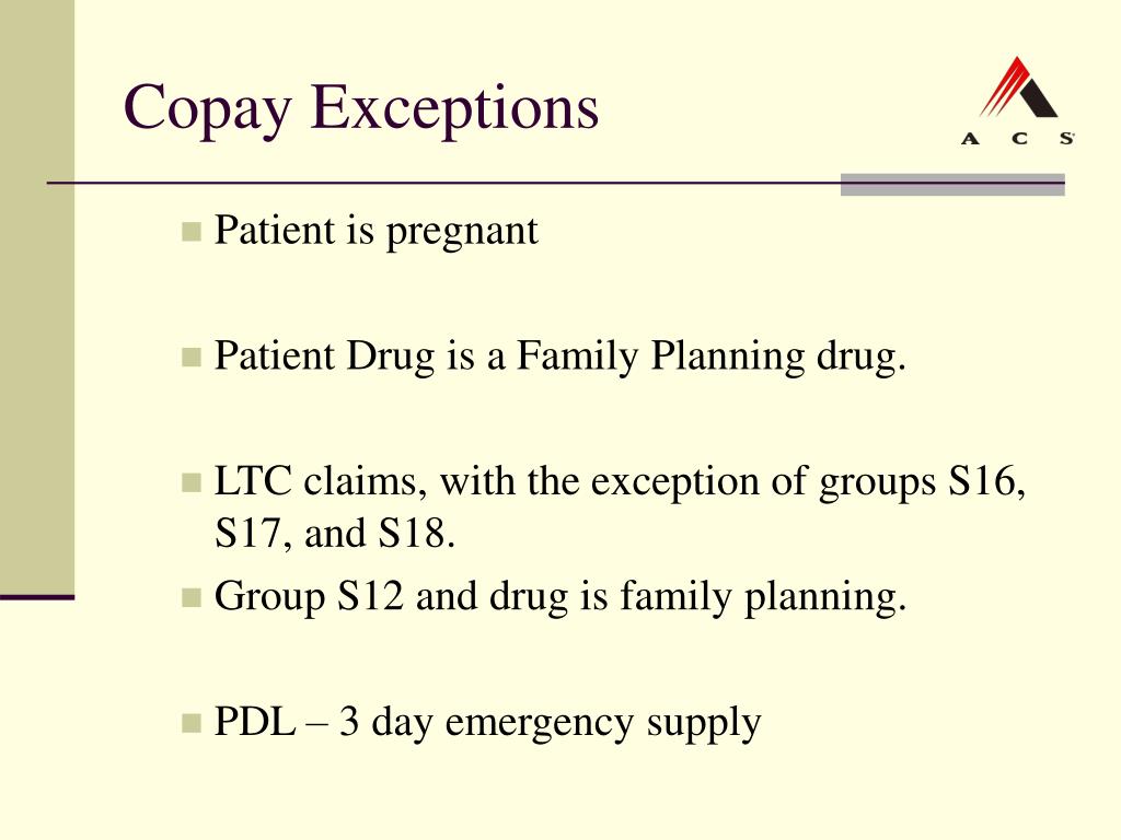 Copay Exceptions • Patient is pregnant • Patient Drug is a Family Planning drug. • LTC claims, with the exception of groups S16, S17, and S18. • Group S12 and drug is family planning. • PDL – 3 day emergency supply