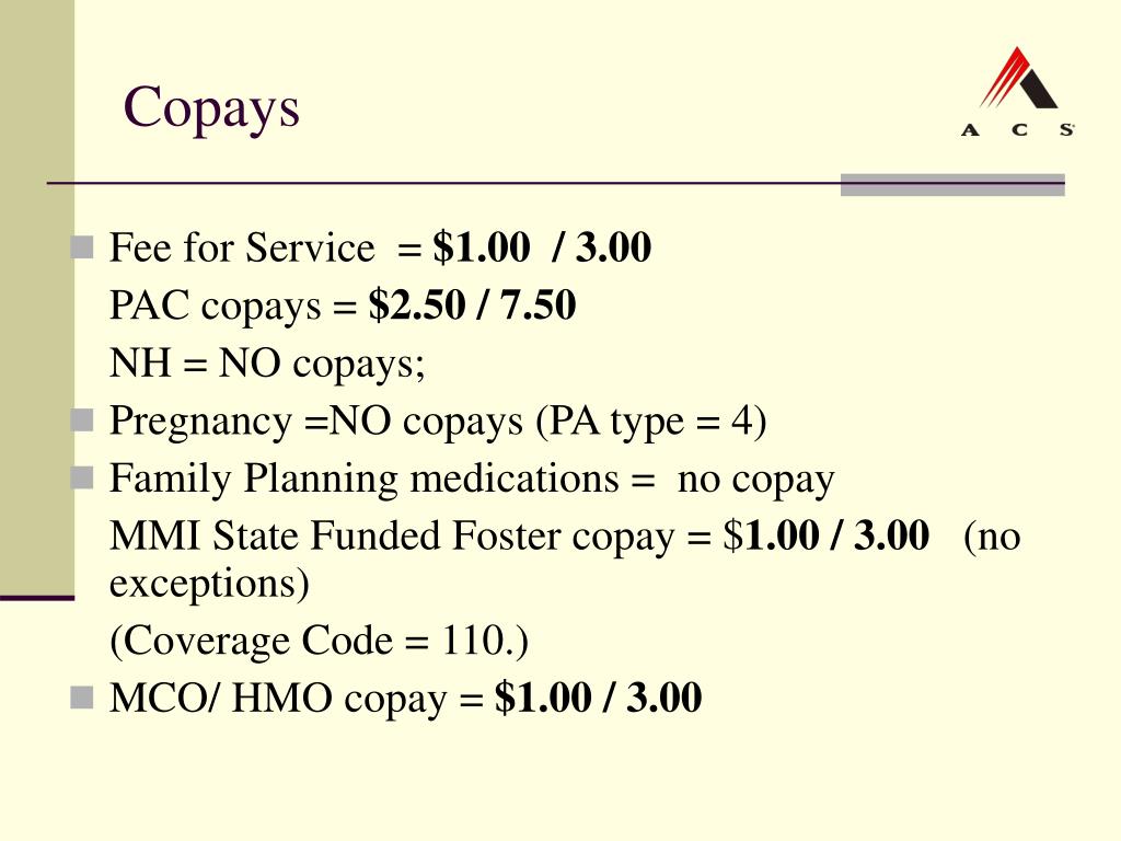 Copays • Fee for Service = $1.00 / 3.00 PAC copays = $2.50 / 7.50 NH = NO copays; • Pregnancy =NO copays (PA type = 4) • Family Planning medications = no copay MMI State Funded Foster copay = $1.00 / 3.00 (no exceptions) (Coverage Code = 110.) • MCO/ HMO copay = $1.00 / 3.00