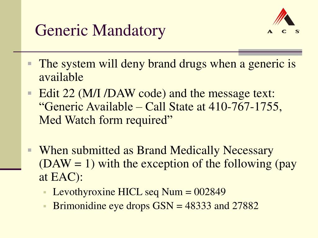 Generic Mandatory • The system will deny brand drugs when a generic is available • Edit 22 (M/I /DAW code) and the message text: “Generic Available – Call State at 410-767-1755, Med Watch form required” • When submitted as Brand Medically Necessary (DAW = 1) with the exception of the following (pay at EAC): • Levothyroxine HICL seq Num = 002849 • Brimonidine eye drops GSN = 48333 and 27882