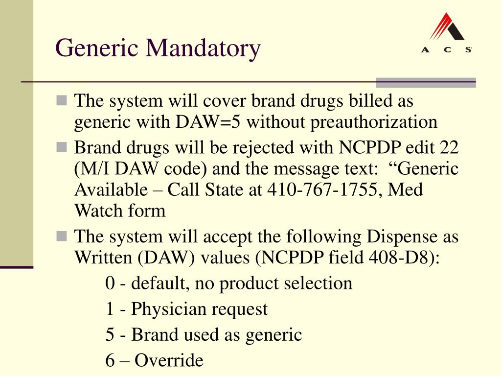 Generic Mandatory • The system will cover brand drugs billed as generic with DAW=5 without preauthorization • Brand drugs will be rejected with NCPDP edit 22 (M/I DAW code) and the message text: “Generic Available – Call State at 410-767-1755, Med Watch form • The system will accept the following Dispense as Written (DAW) values (NCPDP field 408-D8): 0 - default, no product selection 1 - Physician request 5 - Brand used as generic 6 – Override