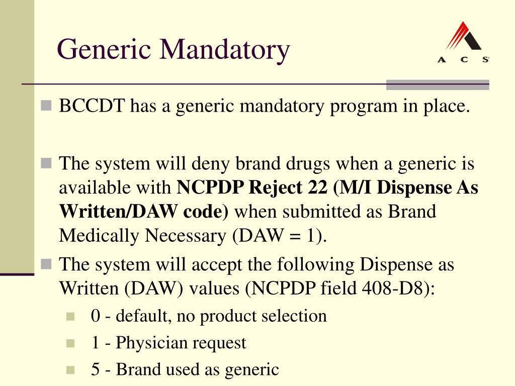 Generic Mandatory • BCCDT has a generic mandatory program in place. • The system will deny brand drugs when a generic is available with NCPDP Reject 22 (M/I Dispense As Written/DAW code) when submitted as Brand Medically Necessary (DAW = 1). • The system will accept the following Dispense as Written (DAW) values (NCPDP field 408-D8): • 0 - default, no product selection • 1 - Physician request • 5 - Brand used as generic