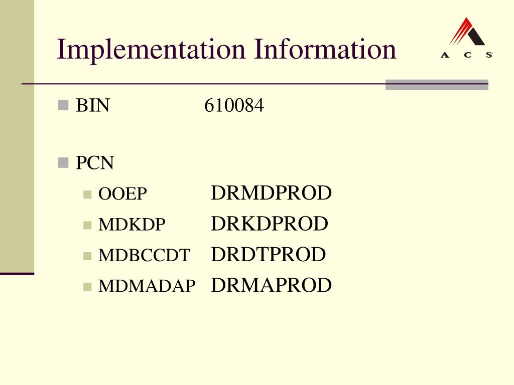 Implementation Information • BIN 610084 • PCN • OOEP DRMDPROD • MDKDP DRKDPROD • MDBCCDT DRDTPROD • MDMADAP DRMAPROD