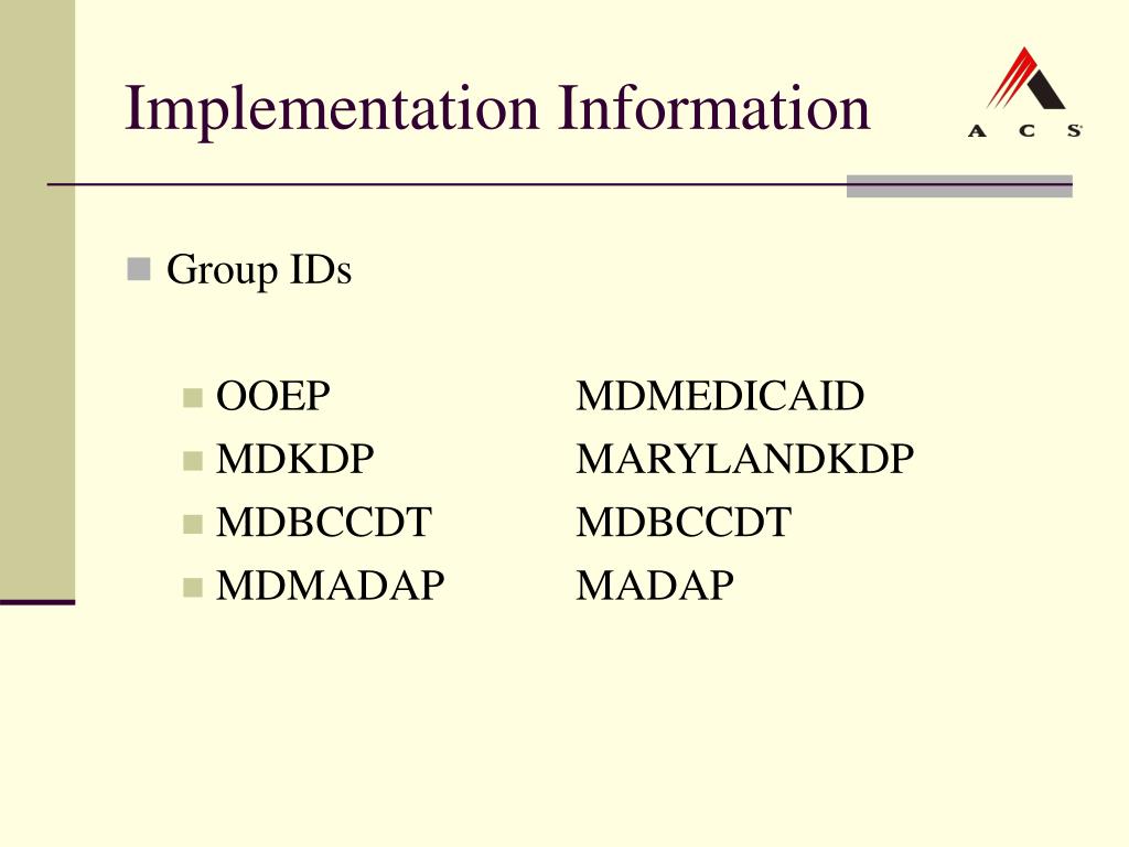 Implementation Information • Group IDs • OOEP MDMEDICAID • MDKDP MARYLANDKDP • MDBCCDT MDBCCDT • MDMADAP MADAP