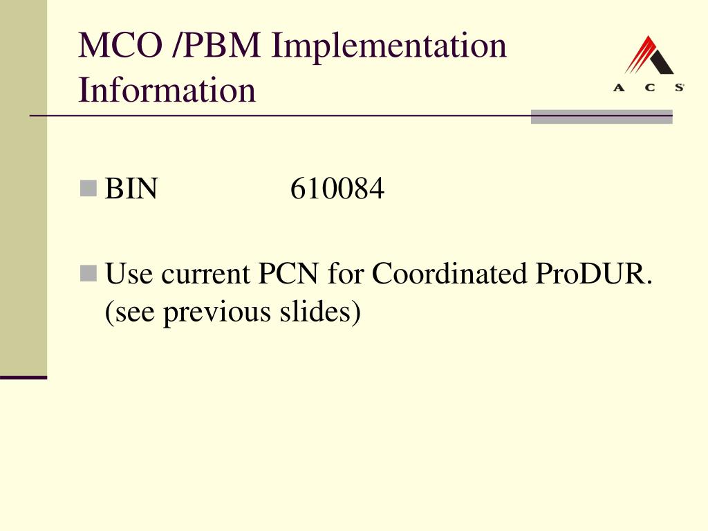 MCO /PBM Implementation Information • BIN 610084 • Use current PCN for Coordinated ProDUR. (see previous slides)