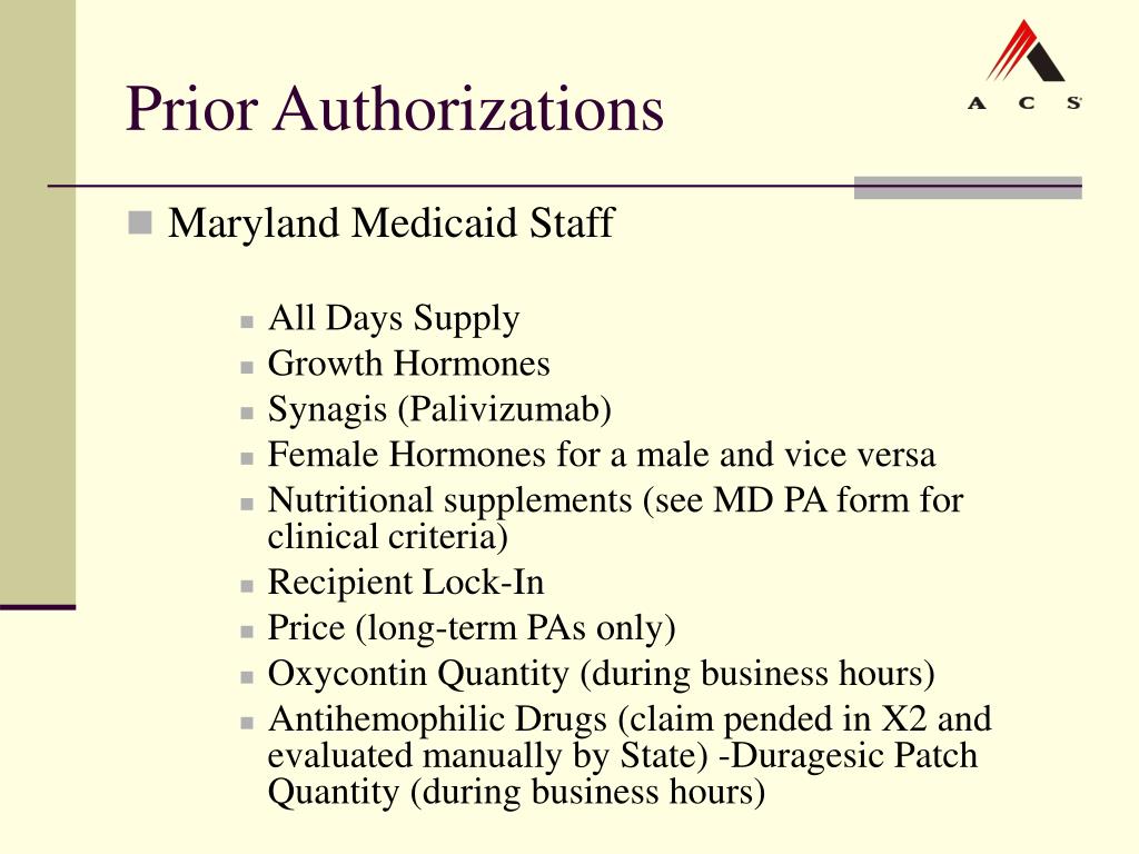 Prior Authorizations • Maryland Medicaid Staff • All Days Supply • Growth Hormones • Synagis (Palivizumab) • Female Hormones for a male and vice versa • Nutritional supplements (see MD PA form for clinical criteria) • Recipient Lock-In • Price (long-term PAs only) • Oxycontin Quantity (during business hours) • Antihemophilic Drugs (claim pended in X2 and evaluated manually by State) -Duragesic Patch Quantity (during business hours)