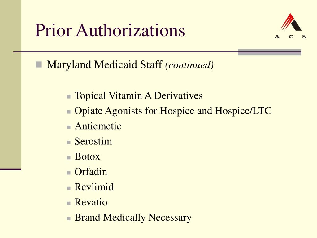 Prior Authorizations • Maryland Medicaid Staff (continued) • Topical Vitamin A Derivatives • Opiate Agonists for Hospice and Hospice/LTC • Antiemetic • Serostim • Botox • Orfadin • Revlimid • Revatio • Brand Medically Necessary