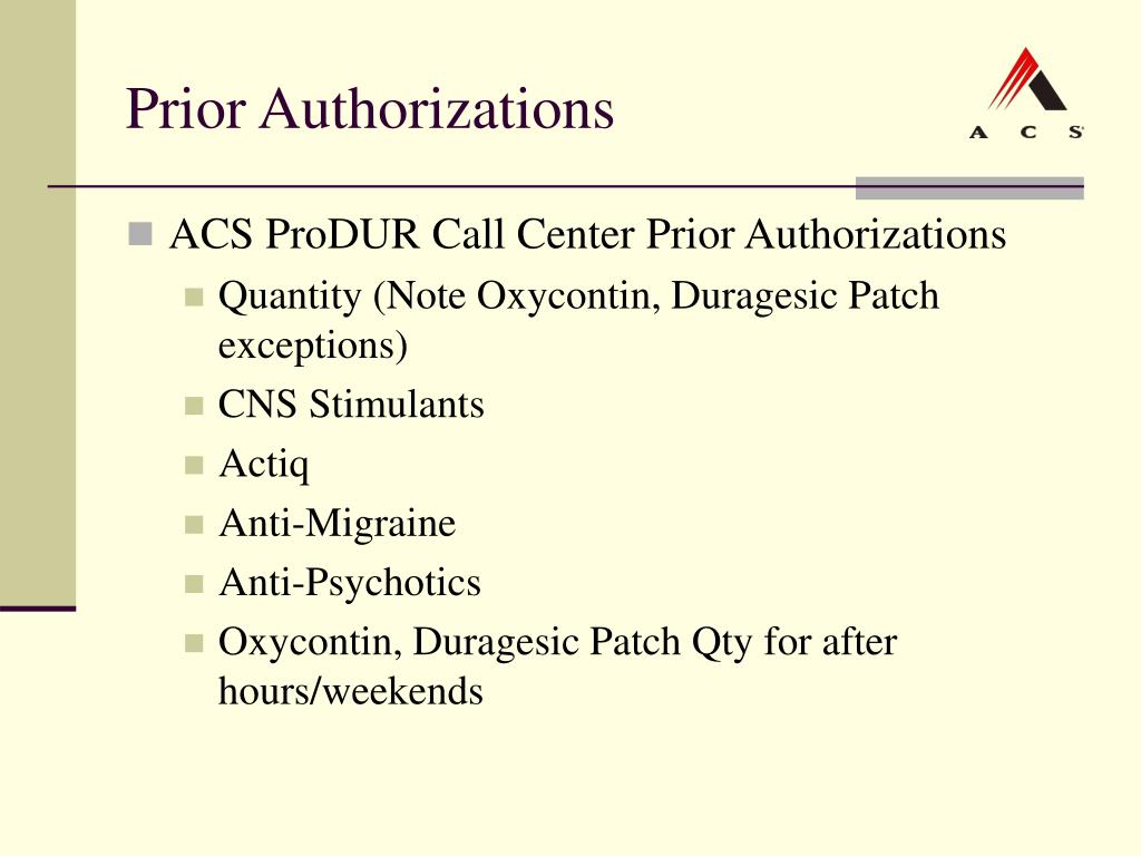 Prior Authorizations • ACS ProDUR Call Center Prior Authorizations • Quantity (Note Oxycontin, Duragesic Patch exceptions) • CNS Stimulants • Actiq • Anti-Migraine • Anti-Psychotics • Oxycontin, Duragesic Patch Qty for after hours/weekends