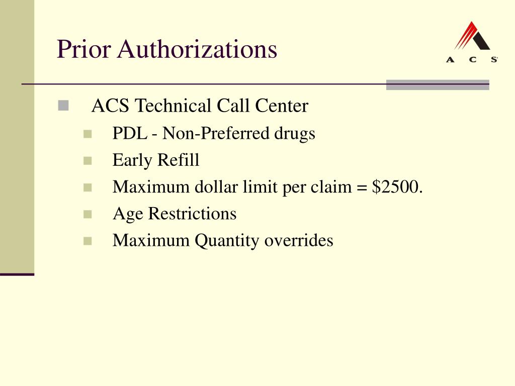 Prior Authorizations • ACS Technical Call Center • PDL - Non-Preferred drugs • Early Refill • Maximum dollar limit per claim = $2500. • Age Restrictions • Maximum Quantity overrides