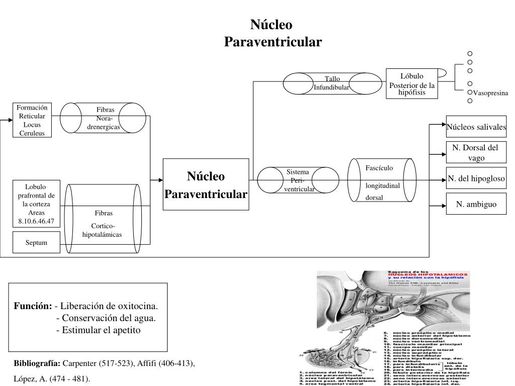 Núcleo Paraventricular Lóbulo Posterior de la hipófisis Tallo Infundibular Vasopresina Formación Reticular Locus Ceruleus Fibras Nora- drenergicas Núcleos salivales N. Dorsal del vago Fascículo longitudinal dorsal Núcleo Paraventricular Sistema Peri- ventricular N. del hipogloso Lobulo prafrontal de la corteza Areas 8.10.6.46.47 N. ambiguo Fibras Cortico- hipotalámicas Septum Función: - Liberación de oxitocina. - Conservación del agua. - Estimular el apetito Bibliografía: Carpenter (517-523), Affifi (406-413), López, A. (474 - 481).