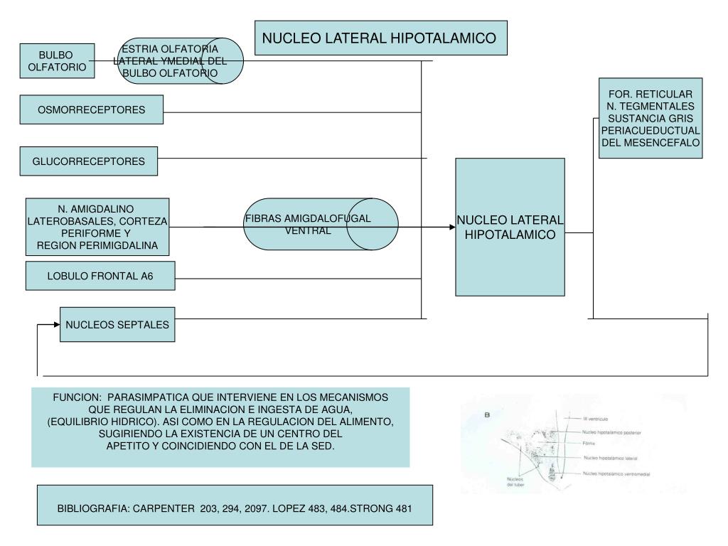 NUCLEO LATERAL HIPOTALAMICO ESTRIA OLFATORIA LATERAL YMEDIAL DEL BULBO OLFATORIO BULBO OLFATORIO FOR. RETICULAR N. TEGMENTALES SUSTANCIA GRIS PERIACUEDUCTUAL DEL MESENCEFALO OSMORRECEPTORES GLUCORRECEPTORES NUCLEO LATERAL HIPOTALAMICO N. AMIGDALINO LATEROBASALES, CORTEZA PERIFORME Y REGION PERIMIGDALINA FIBRAS AMIGDALOFUGAL VENTRAL LOBULO FRONTAL A6 NUCLEOS SEPTALES FUNCION: PARASIMPATICA QUE INTERVIENE EN LOS MECANISMOS QUE REGULAN LA ELIMINACION E INGESTA DE AGUA, (EQUILIBRIO HIDRICO). ASI COMO EN LA REGULACION DEL ALIMENTO, SUGIRIENDO LA EXISTENCIA DE UN CENTRO DEL APETITO Y COINCIDIENDO CON EL DE LA SED. BIBLIOGRAFIA: CARPENTER203, 294, 2097. LOPEZ 483, 484.STRONG 481