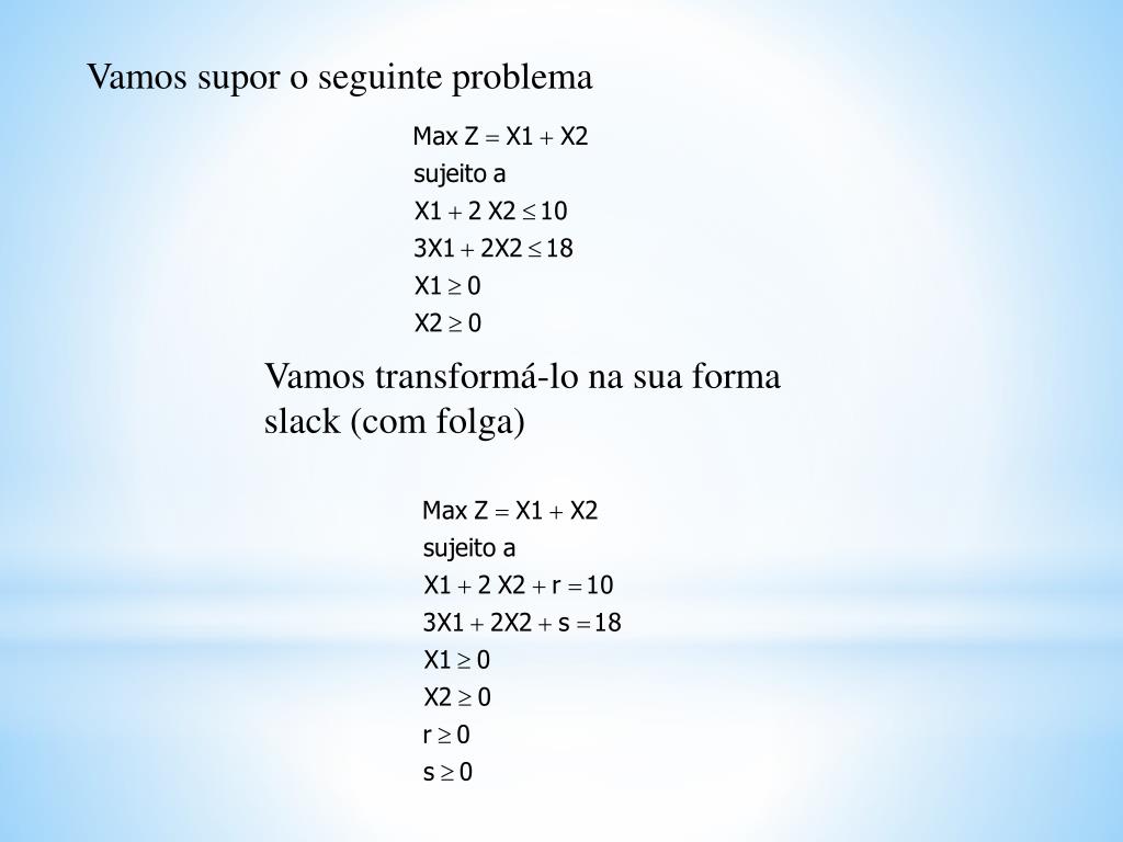 Como transformar problemas de PL na sua forma canônica perfeita...... Primeiro passo é colocar o sistema na sua forma slack...