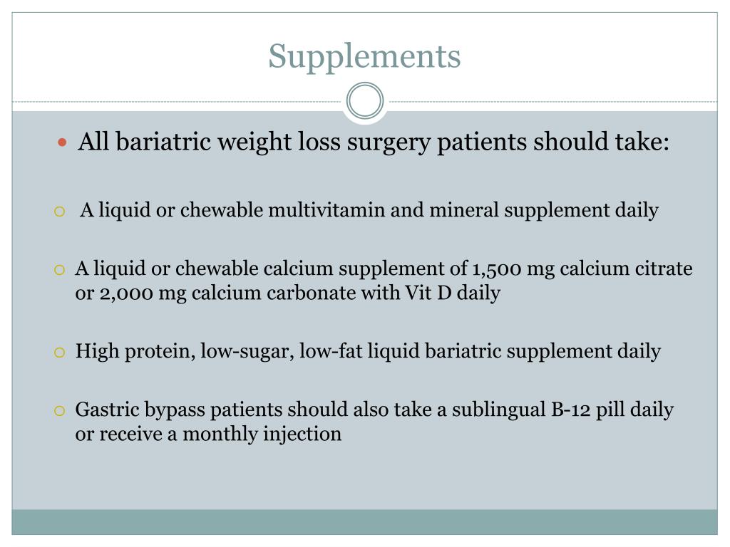 Supplements • All bariatric weight loss surgery patients should take: • A liquid or chewable multivitamin and mineral supplement daily • A liquid or chewable calcium supplement of 1,500 mg calcium citrate or 2,000 mg calcium carbonate with Vit D daily • High protein, low-sugar, low-fat liquid bariatric supplement daily • Gastric bypass patients should also take a sublingual B-12 pill daily or receive a monthly injection