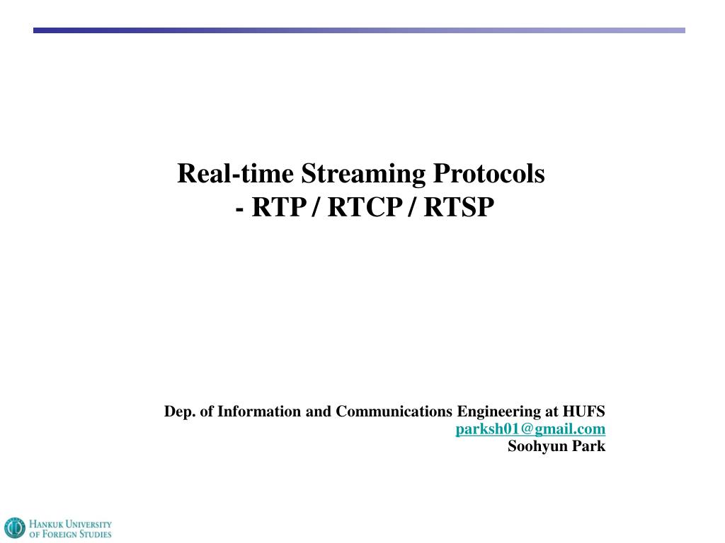 Real-time Streaming Protocols - RTP / RTCP / RTSP Dep. of Information and Communications Engineering at HUFS parksh01@gmail.com Soohyun Park