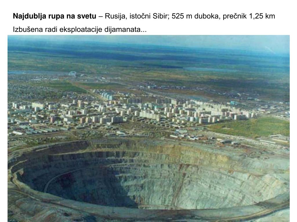 Najdublja rupa na svetu – Rusija, istočni Sibir; 525 m duboka, prečnik 1,25 km Izbušena radi eksploatacije dijamanata...