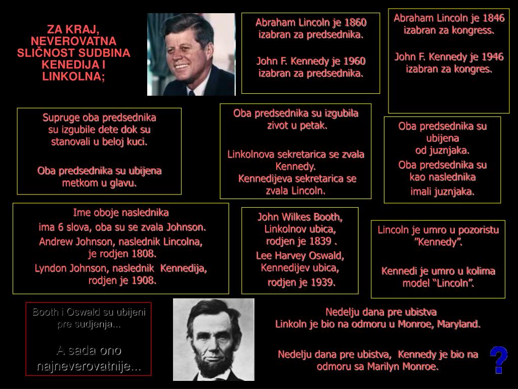 Abraham Lincoln je 1846 izabran za kongress. John F. Kennedy je 1946 izabran za kongres. Abraham Lincoln je 1860izabran za predsednika. John F. Kennedy je 1960 izabran za predsednika. ZA KRAJ, NEVEROVATNA SLIČNOST SUDBINA KENEDIJA I LINKOLNA; Oba predsednika su izgubila zivot u petak. Linkolnova sekretarica se zvala Kennedy. Kennedijeva sekretarica se zvala Lincoln. Supruge oba predsednikasu izgubile dete dok sustanovali u beloj kuci. Oba predsednika su ubijenametkom u glavu. Oba predsednika su ubijenaod juznjaka. Oba predsednika su kao naslednika imali juznjaka. Ime oboje naslednika ima 6 slova, oba su se zvala Johnson. Andrew Johnson, naslednik Lincolna, je rodjen 1808. Lyndon Johnson, naslednik Kennedija, rodjen je 1908. John Wilkes Booth, Linkolnov ubica, rodjen je 1839 . Lee Harvey Oswald, Kennedijev ubica, rodjen je 1939. Lincoln je umro u pozoristu ”Kennedy”. Kennedi je umro u kolima model “Lincoln”. Booth i Oswald su ubijeni pre sudjenja... A sada ono najneverovatnije... Nedelju dana pre ubistva Linkoln je bio na odmoru u Monroe, Maryland. Nedelju dana pre ubistva, Kennedy je bio na odmoru sa Marilyn Monroe.