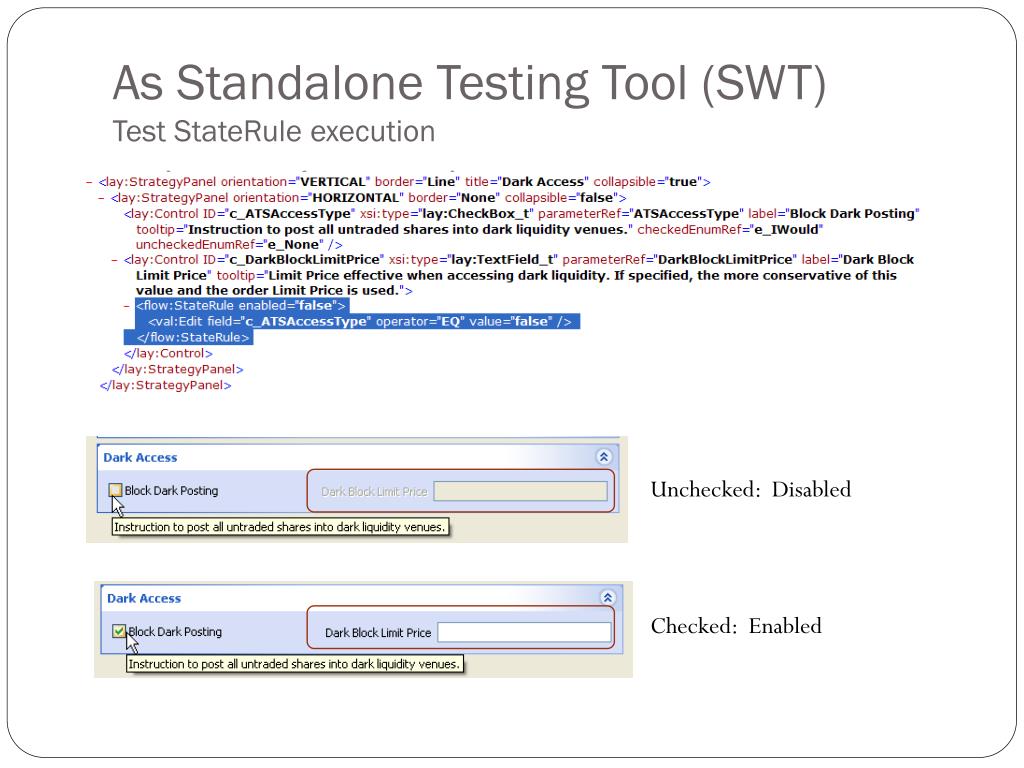 As Standalone Testing Tool (SWT)Test StateRule execution Unchecked: Disabled Checked: Enabled