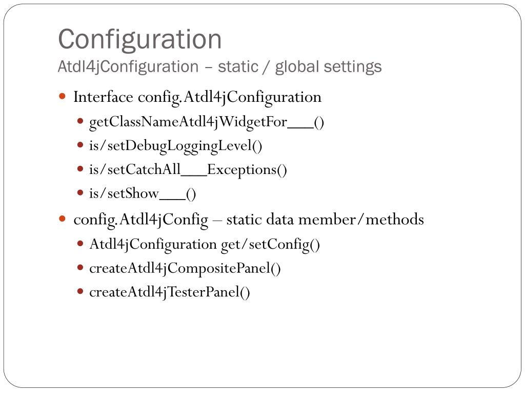 ConfigurationAtdl4jConfiguration – static / global settings • Interface config.Atdl4jConfiguration • getClassNameAtdl4jWidgetFor___() • is/setDebugLoggingLevel() • is/setCatchAll___Exceptions() • is/setShow___() • config.Atdl4jConfig – static data member/methods • Atdl4jConfiguration get/setConfig() • createAtdl4jCompositePanel() • createAtdl4jTesterPanel()