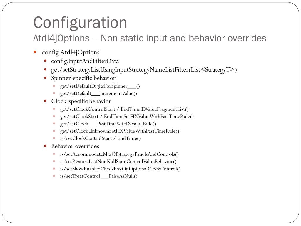 ConfigurationAtdl4jOptions – Non-static input and behavior overrides • config.Atdl4jOptions • config.InputAndFilterData • get/setStrategyListUsingInputStrategyNameListFilter(List<StrategyT>) • Spinner-specific behavior • get/setDefaultDigitsForSpinner___() • get/setDefault___IncrementValue() • Clock-specific behavior • get/setClockControlStart / EndTimeIDValueFragmentList() • get/setClockStart / EndTimeSetFIXValueWithPastTimeRule() • get/setClock___PastTimeSetFIXValueRule() • get/setClockUnknownSetFIXValueWithPastTimeRule() • is/setClockControlStart / EndTime() • Behavior overrides • is/setAccommodateMixOfStrategyPanelsAndControls() • is/setRestoreLastNonNullStateControlValueBehavior() • is/setShowEnabledCheckboxOnOptionalClockControl() • is/setTreatControl___FalseAsNull()