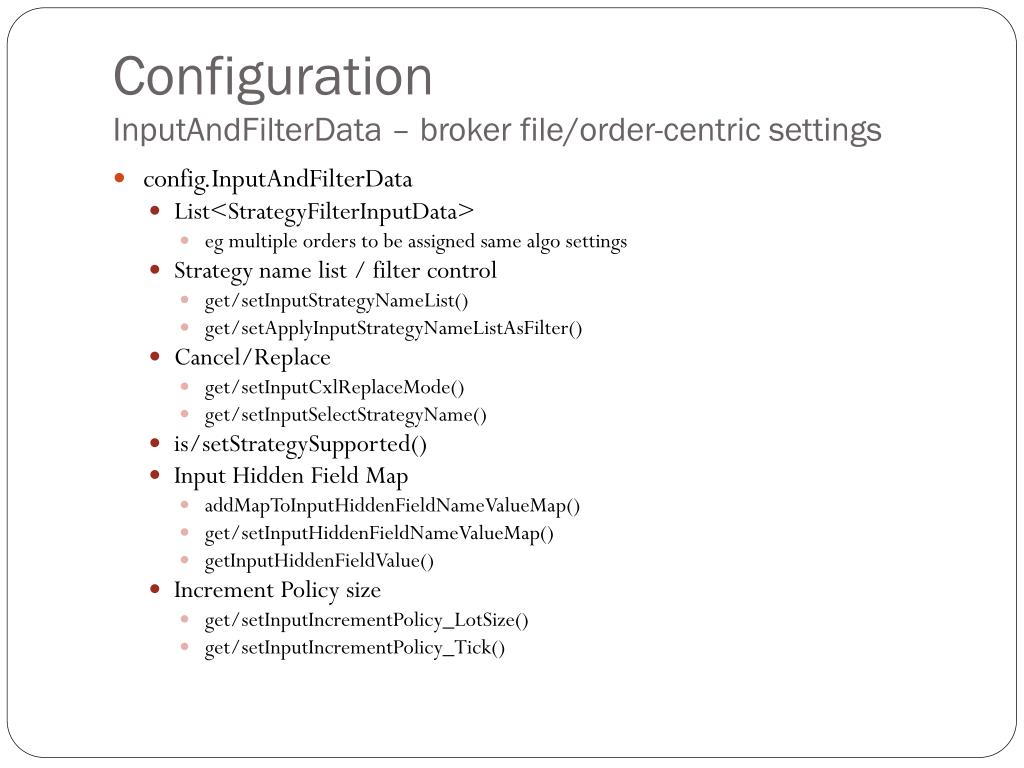 ConfigurationInputAndFilterData – broker file/order-centric settings • config.InputAndFilterData • List<StrategyFilterInputData> • eg multiple orders to be assigned same algo settings • Strategy name list / filter control • get/setInputStrategyNameList() • get/setApplyInputStrategyNameListAsFilter() • Cancel/Replace • get/setInputCxlReplaceMode() • get/setInputSelectStrategyName() • is/setStrategySupported() • Input Hidden Field Map • addMapToInputHiddenFieldNameValueMap() • get/setInputHiddenFieldNameValueMap() • getInputHiddenFieldValue() • Increment Policy size • get/setInputIncrementPolicy_LotSize() • get/setInputIncrementPolicy_Tick()