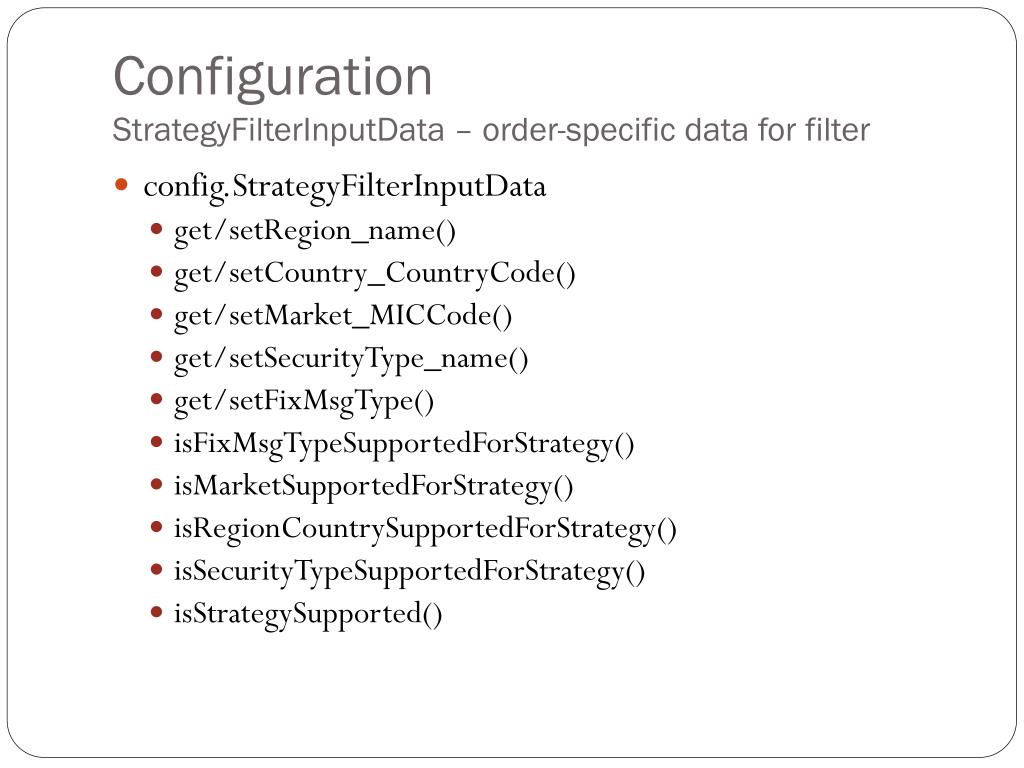 ConfigurationStrategyFilterInputData – order-specific data for filter • config.StrategyFilterInputData • get/setRegion_name() • get/setCountry_CountryCode() • get/setMarket_MICCode() • get/setSecurityType_name() • get/setFixMsgType() • isFixMsgTypeSupportedForStrategy() • isMarketSupportedForStrategy() • isRegionCountrySupportedForStrategy() • isSecurityTypeSupportedForStrategy() • isStrategySupported()