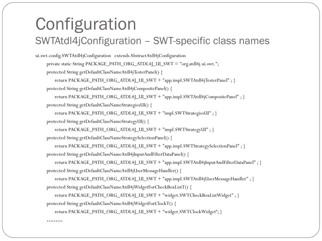 ConfigurationSWTAtdl4jConfiguration – SWT-specific class names ui.swt.config.SWTAtdl4jConfiguration extends AbstractAtdl4jConfiguration private static String PACKAGE_PATH_ORG_ATDL4J_UI_SWT = "org.atdl4j.ui.swt."; protected String getDefaultClassNameAtdl4jTesterPanel() { return PACKAGE_PATH_ORG_ATDL4J_UI_SWT + "app.impl.SWTAtdl4jTesterPanel" ; } protected String getDefaultClassNameAtdl4jCompositePanel() { return PACKAGE_PATH_ORG_ATDL4J_UI_SWT + "app.impl.SWTAtdl4jCompositePanel" ; } protected String getDefaultClassNameStrategiesUI() { return PACKAGE_PATH_ORG_ATDL4J_UI_SWT + "impl.SWTStrategiesUI" ; } protected String getDefaultClassNameStrategyUI() { return PACKAGE_PATH_ORG_ATDL4J_UI_SWT + "impl.SWTStrategyUI" ; } protected String getDefaultClassNameStrategySelectionPanel() { return PACKAGE_PATH_ORG_ATDL4J_UI_SWT + "app.impl.SWTStrategySelectionPanel" ; } protected String getDefaultClassNameAtdl4jInputAndFilterDataPanel() { return PACKAGE_PATH_ORG_ATDL4J_UI_SWT + "app.impl.SWTAtdl4jInputAndFilterDataPanel" ; } protected String getDefaultClassNameAtdl4jUserMessageHandler() { return PACKAGE_PATH_ORG_ATDL4J_UI_SWT + "app.impl.SWTAtdl4jUserMessageHandler" ; } protected String getDefaultClassNameAtdl4jWidgetForCheckBoxListT() { return PACKAGE_PATH_ORG_ATDL4J_UI_SWT + "widget.SWTCheckBoxListWidget" ; } protected String getDefaultClassNameAtdl4jWidgetForClockT() { return PACKAGE_PATH_ORG_ATDL4J_UI_SWT + "widget.SWTClockWidget“; } ………