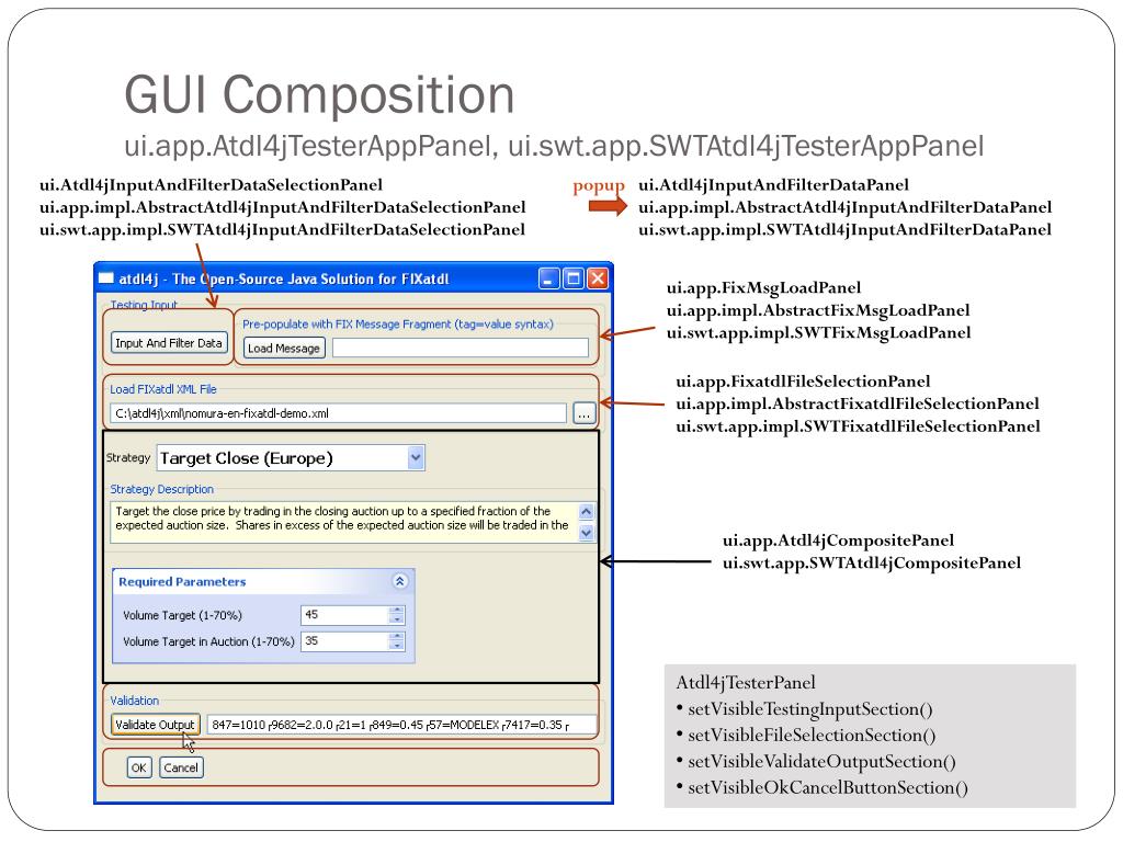 GUI Compositionui.app.Atdl4jCompositePanel, ui.swt.app.SWTAtdl4jCompositePanel ui.app.StrategySelectionPanel ui.app.impl.AbstractStrategySelectionPanel ui.swt.app.impl.SWTStrategySelectionPanel ui.app.StrategyDescriptionPanel ui.app.impl.AbstractStrategyDescriptionPanel ui.swt.app.impl.SWTStrategyDescriptionPanel ui.app.Atdl4jCompositePanel ui.swt.app.SWTAtdl4jCompositePanel Atdl4jCompositePanel’s own OK / Cancel buttons • Atdl4jCompositePanel • setVisibleOkCancelButtonSection()