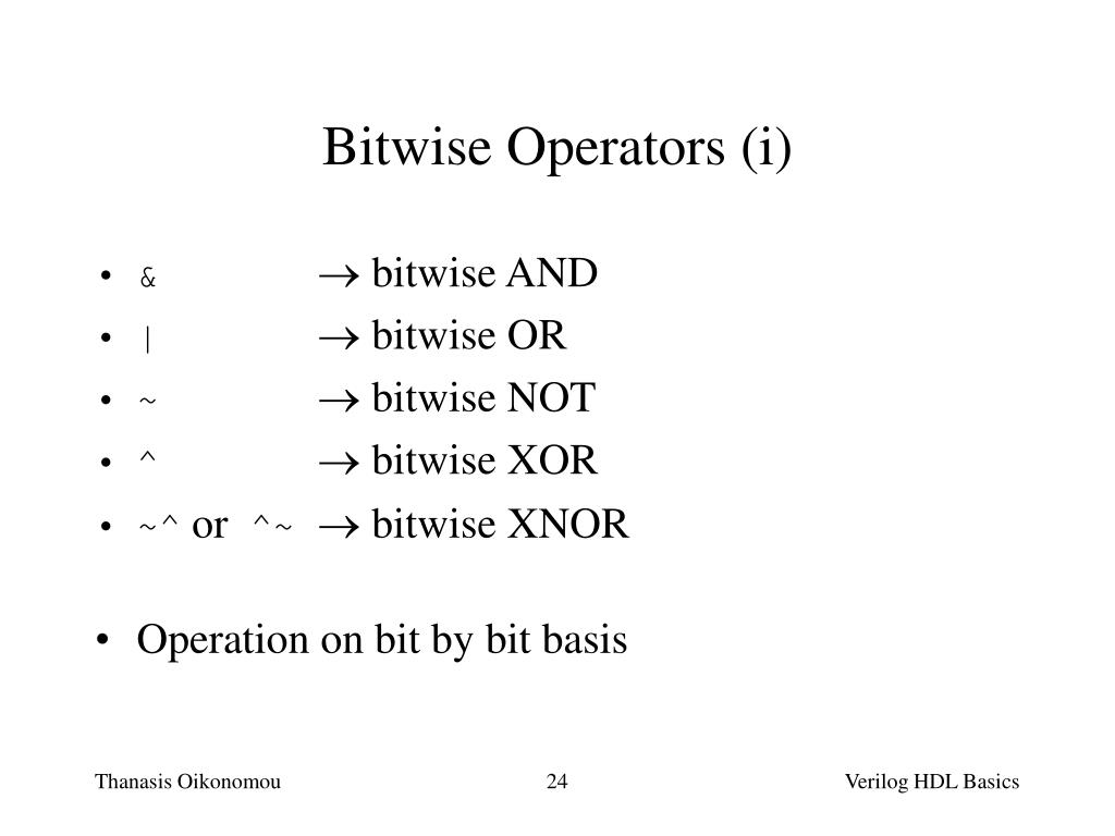 Bitwise Operators (i) • & bitwise AND • | bitwise OR • ~ bitwise NOT • ^ bitwise XOR • ~^ or ^~ bitwise XNOR • Operation on bit by bit basis Verilog HDL Basics