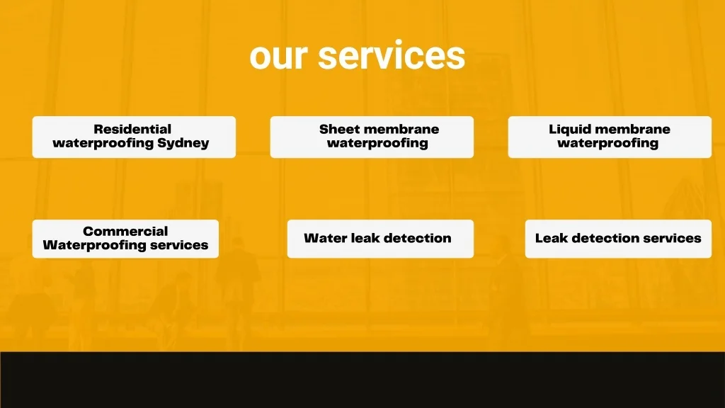 our services Residential Sheet membrane waterproofing Liquid membrane waterproofing waterproofing Sydney Commercial Waterproofing services Water leak detection Leak detection services