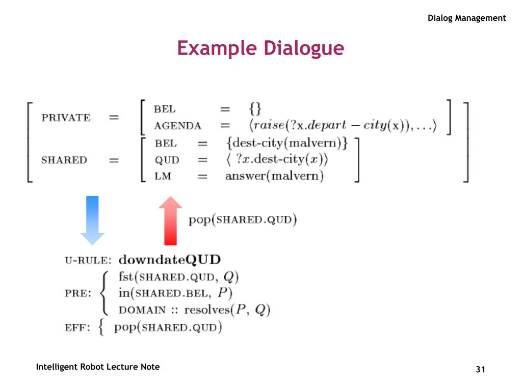 Information State Approach • Dialogue Moves • Trigger the update of the information state • Be correlated with externally performed actions • Update Rules • Govern the updating of the information state • Update Strategy • For deciding which rules to apply at a given point from the set of applicable ones Intelligent Robot Lecture Note