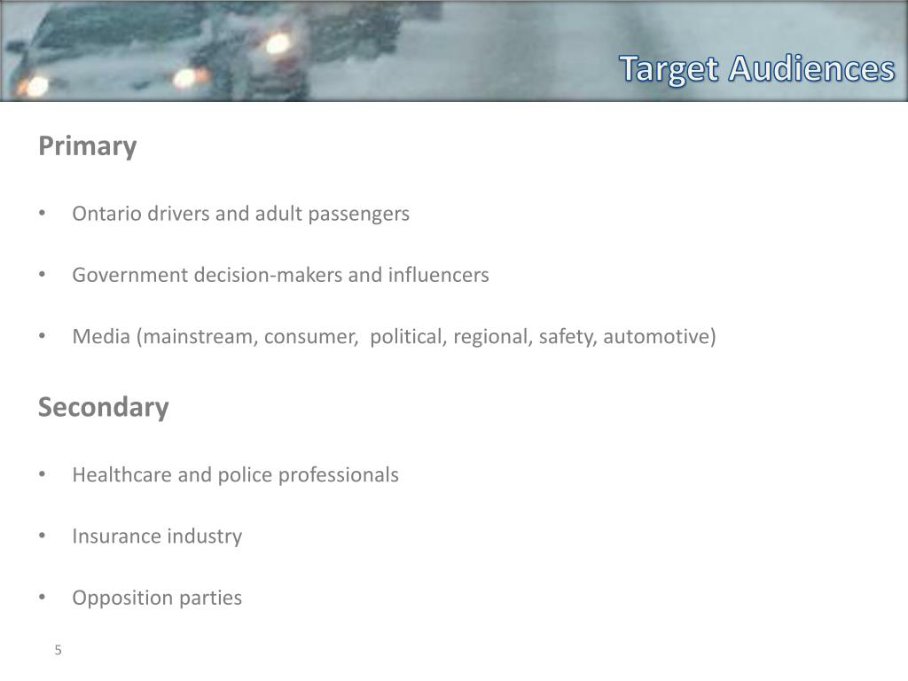 Target Audiences • Primary • Ontario drivers and adult passengers • Government decision-makers and influencers • Media (mainstream, consumer, political, regional, safety, automotive) • Secondary • Healthcare and police professionals • Insurance industry • Opposition parties