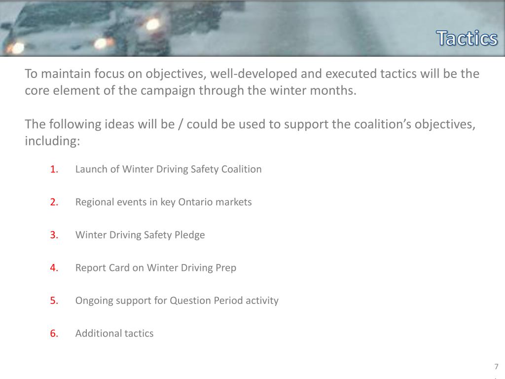 Tactics • To maintain focus on objectives, well-developed and executed tactics will be the core element of the campaign through the winter months. • The following ideas will be / could be used to support the coalition’s objectives, including: • Launch of Winter Driving Safety Coalition • Regional events in key Ontario markets • Winter Driving Safety Pledge • Report Card on Winter Driving Prep • Ongoing support for Question Period activity • Additional tactics