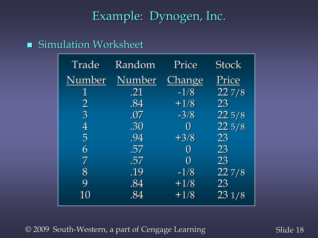 Example: Dynogen, Inc. • Simulation Worksheet Trade Random Price Stock NumberNumberChangePrice 1 .21 -1/8 22 7/8 2 .84 +1/8 23 3 .07 -3/8 22 5/8 4 .30 0 22 5/8 5 .94 +3/8 23 6 .57 0 23 7 .57 0 23 8 .19 -1/8 22 7/8 9 .84 +1/8 23 10 .84 +1/8 23 1/8