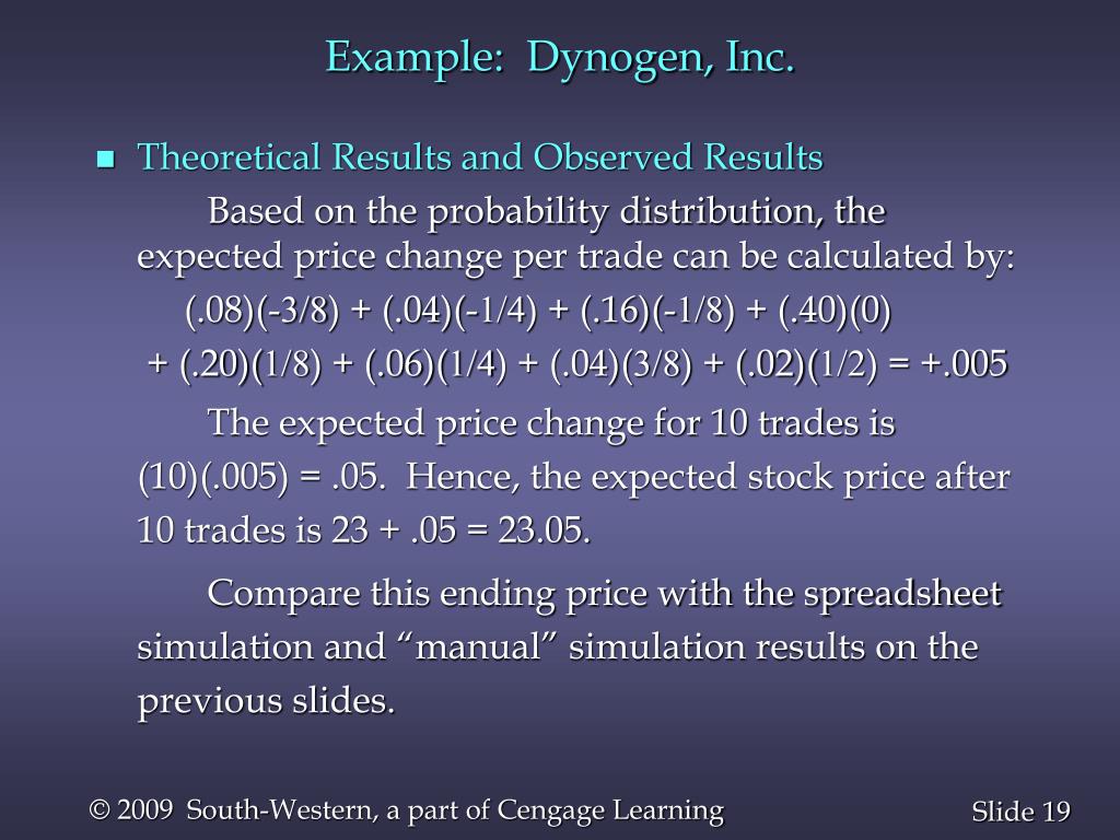 Example: Dynogen, Inc. • Theoretical Results and Observed Results Based on the probability distribution, the expected price change per trade can be calculated by: (.08)(-3/8) + (.04)(-1/4) + (.16)(-1/8) + (.40)(0) + (.20)(1/8) + (.06)(1/4) + (.04)(3/8) + (.02)(1/2) = +.005 The expected price change for 10 trades is (10)(.005) = .05. Hence, the expected stock price after 10 trades is 23 + .05 = 23.05. Compare this ending price with the spreadsheet simulation and “manual” simulation results on the previous slides.