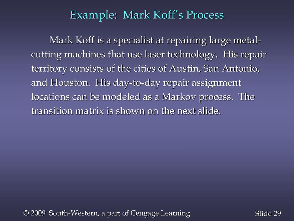 Example: Mark Koff’s Process Mark Koff is a specialist at repairing large metal- cutting machines that use laser technology. His repair territory consists of the cities of Austin, San Antonio, and Houston. His day-to-day repair assignment locations can be modeled as a Markov process. The transition matrix is shown on the next slide.