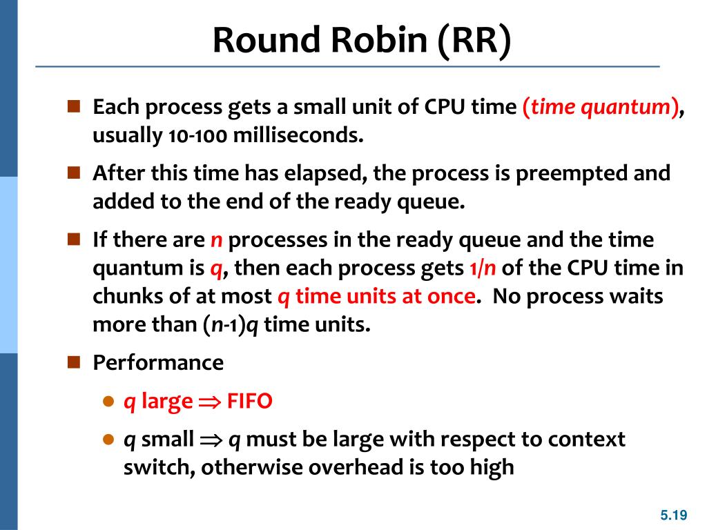 Round Robin (RR) • Each process gets a small unit of CPU time (time quantum), usually 10-100 milliseconds. • After this time has elapsed, the process is preempted and added to the end of the ready queue. • If there are n processes in the ready queue and the time quantum is q, then each process gets 1/nof the CPU time in chunks of at most q time units at once. No process waits more than (n-1)q time units. • Performance • q large FIFO • q small q must be large with respect to context switch, otherwise overhead is too high