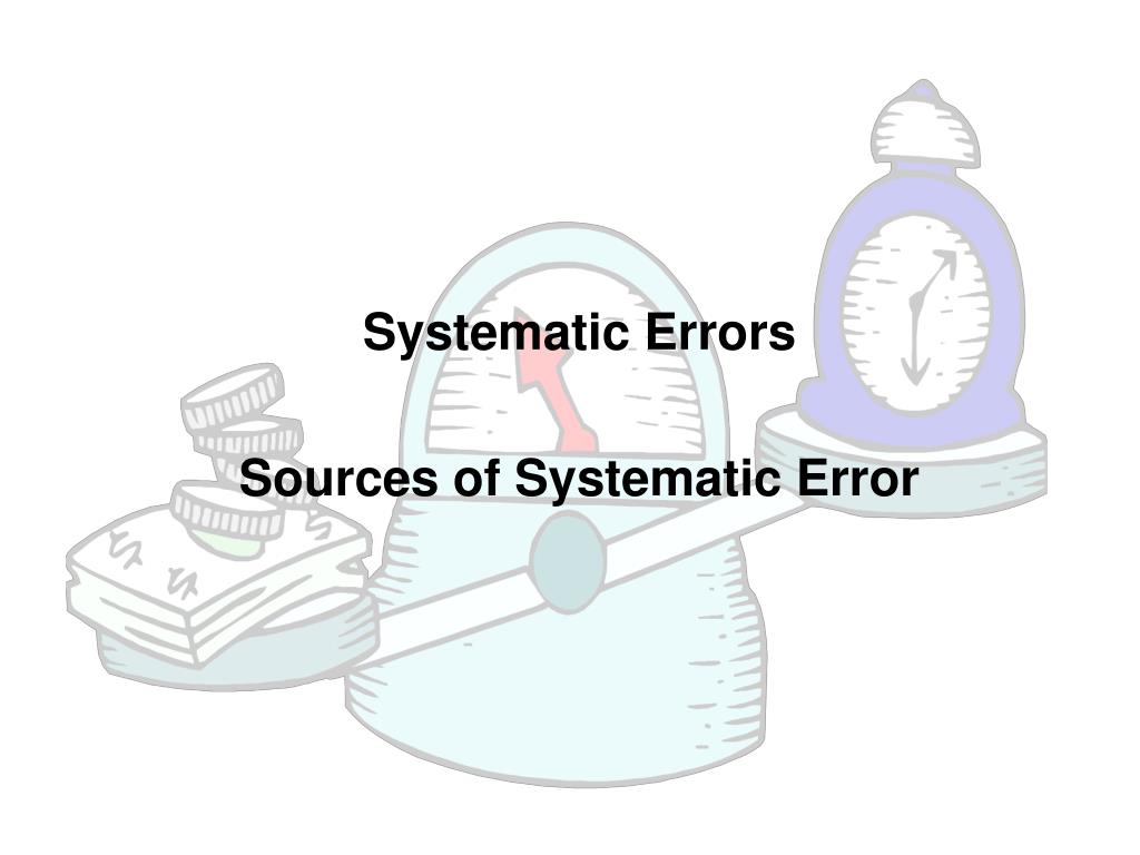 Sources of Systematic Error:System disturbance due to measurement If we consider the thermometer to be measuring the amount by which the temperature in the beaker deviates from the current temperature of the thermometer. then the disturbance error can be considered as a scale error Scale Error Scale factor Measured Quantity