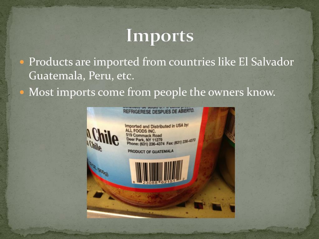 Imports • Products are imported from countries like El Salvador Guatemala, Peru, etc. • Most imports come from people the owners know.