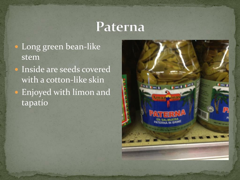 Paterna • Long green bean-like stem • Inside are seeds covered with a cotton-like skin • Enjoyed with límon and tapatío