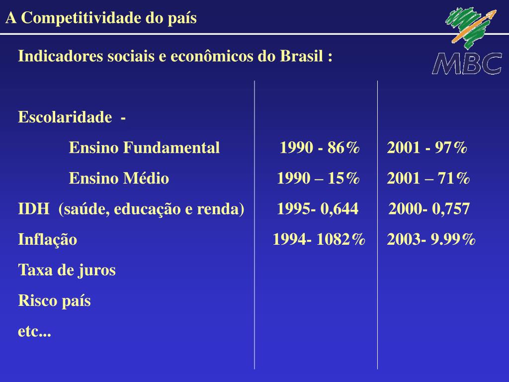 A Competitividade do país Indicadores sociais e econômicos do Brasil : Escolaridade - Ensino Fundamental 1990 - 86% 2001 - 97% Ensino Médio 1990 – 15% 2001 – 71% IDH (saúde, educação e renda) 1995- 0,644 2000- 0,757 Inflação 1994- 1082% 2003- 9.99% Taxa de juros Risco país etc...