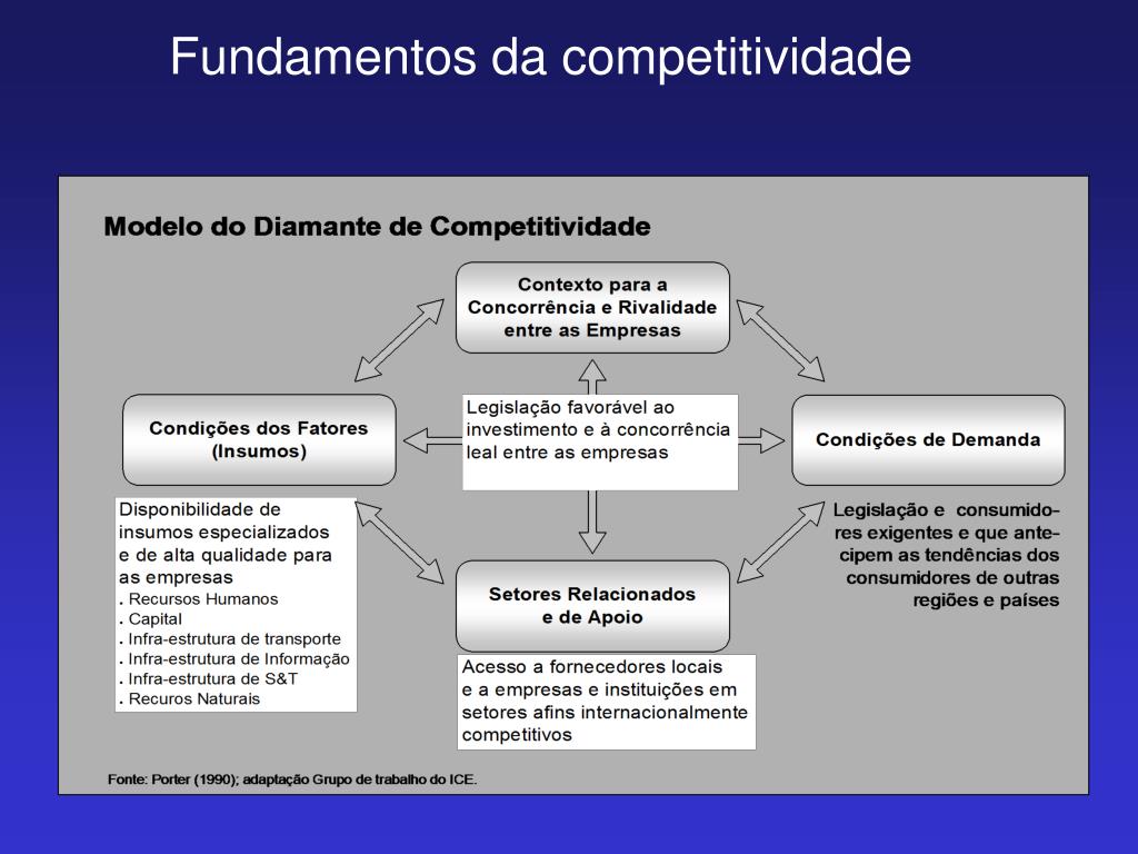 O Índice de Competitividade Global • Instituições • Infra-estrutura • Macro-economia • Saúde e educação primária • Educação superior e treinamento • Eficiência do mercado (bens, mão-de-obra, financeiro) • Aptidão tecnológica • Tamanho do mercado • Sofisticação do negócio • Inovação • Exigências básicas • Essencial em economias impulsionadas por fator • Melhorias em eficiência • Essencial em economias impulsionadas por eficiência • Inovação e Sofisticação • Essencial em economias impulsionadas por inovação