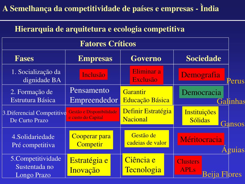 A Semelhança da competitividade de países e empresas - Ìndia Hierarquia de arquitetura e ecologia competitiva Fatores Críticos Fases Empresas Governo Sociedade Eliminar a Exclusão 1. Socialização da dignidade BA Demografia Inclusão Perus Pensamento Empreendedor Democracia 2. Formação de Estrutura Básica Garantir Educação Básica Galinhas Definir Estratégia Nacional Instituições Sólidas Gestão e Disponibilidade e custo do Capital 3.Diferencial Competitivo De Curto Prazo Gansos Gestão de cadeias de valor Cooperar para Competir 4.Solidariedade Pré competitiva Méritocracia Águias 5.Competitividade Sustentada no Longo Prazo Ciência e Tecnologia Estratégia e Inovação Clusters APLs Beija Flores