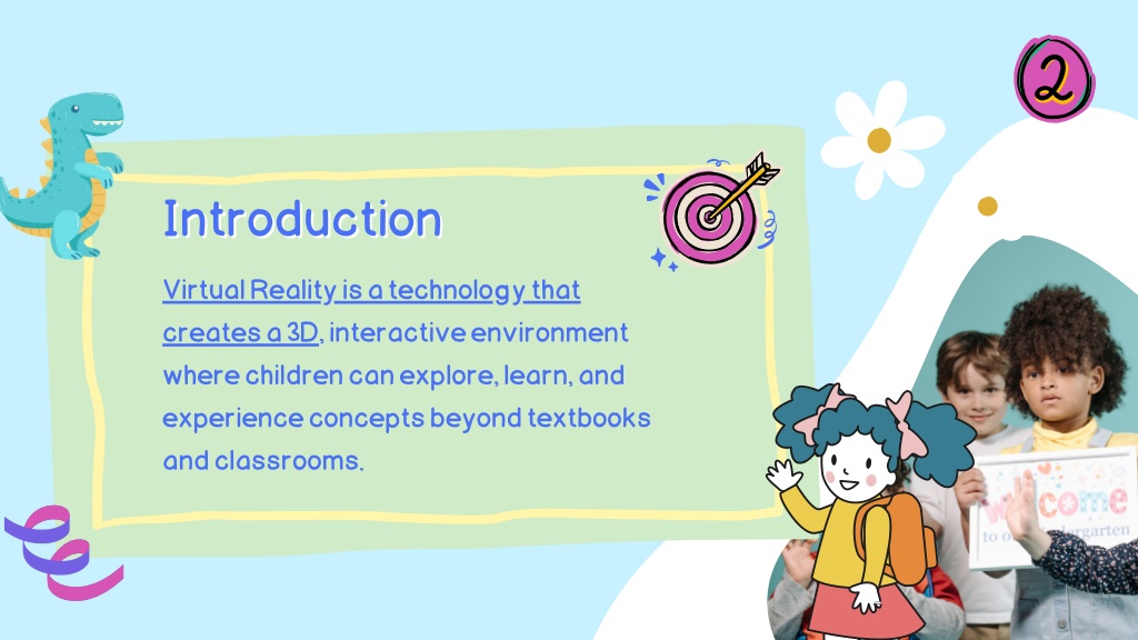 2. Introduction Introduction Virtual Reality is a technology that creates a 3D, interactive environment where children can explore, learn, and experience concepts beyond textbooks and classrooms.