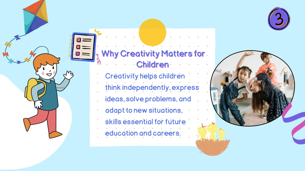 3. Why Creativity Matters for Why Creativity Matters for Children Children Creativity helps children think independently, express ideas, solve problems, and adapt to new situations, skills essential for future education and careers.
