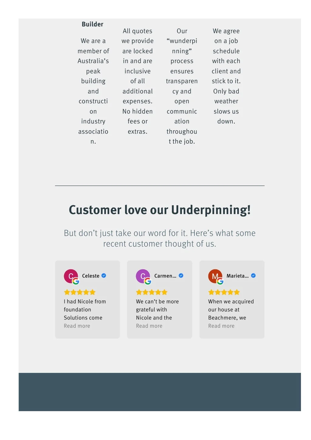 Builder All quotes we provide Our We agree on a job We are a “wunderpi member of Australia’s are locked in and are nning” process schedule with each peak building inclusive of all ensures transparen client and stick to it. and additional expenses. cy and open Only bad weather constructi on No hidden fees or communic ation slows us down. industry associatio n. extras. throughou t the job. Customer love our Underpinning! But don’t just take our word for it. Here’s what some recent customer thought of us. Celeste Carmen… Marieta… I had Nicole from foundation Solutions come We can’t be more grateful with Nicole and the When we acquired our house at Beachmere, we Read more Read more Read more