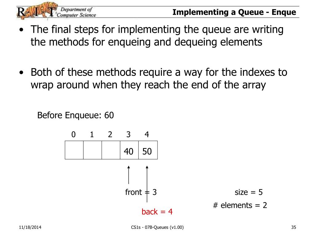Understanding How To Implement a Queue Enque: 50 0 1 2 3 4 50 40 front = 3 size = 5 # elements = 2 back = 4 CS1s - 07B-Queues (v1.00)