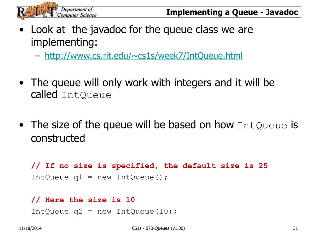 Implementing a Queue - Javadoc • Look at the javadoc for the queue class we are implementing: • http://www.cs.rit.edu/~cs1s/week7/IntQueue.html • The queue will only work with integers and it will be called IntQueue • The size of the queue will be based on how IntQueue is constructed // If no size is specified, the default size is 25 IntQueue q1 = new IntQueue(); // Here the size is 10 IntQueue q2 = new IntQueue(10); CS1s - 07B-Queues (v1.00)