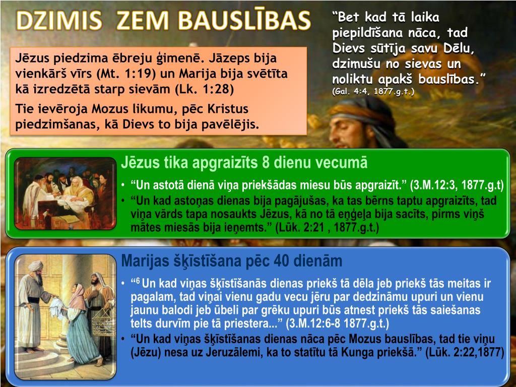 DZIMIS ZEM BAUSLĪBAS “Bet kad tā laika piepildīšana nāca, tad Dievs sūtīja savu Dēlu, dzimušu no sievas un noliktu apakš bauslības.” (Gal. 4:4, 1877.g.t.) Jēzus piedzima ēbreju ģimenē. Jāzeps bija vienkārš vīrs (Mt. 1:19) un Marija bija svētīta kā izredzētā starp sievām (Lk. 1:28) Tie ievēroja Mozus likumu, pēc Kristus piedzimšanas, kā Dievs to bija pavēlējis.