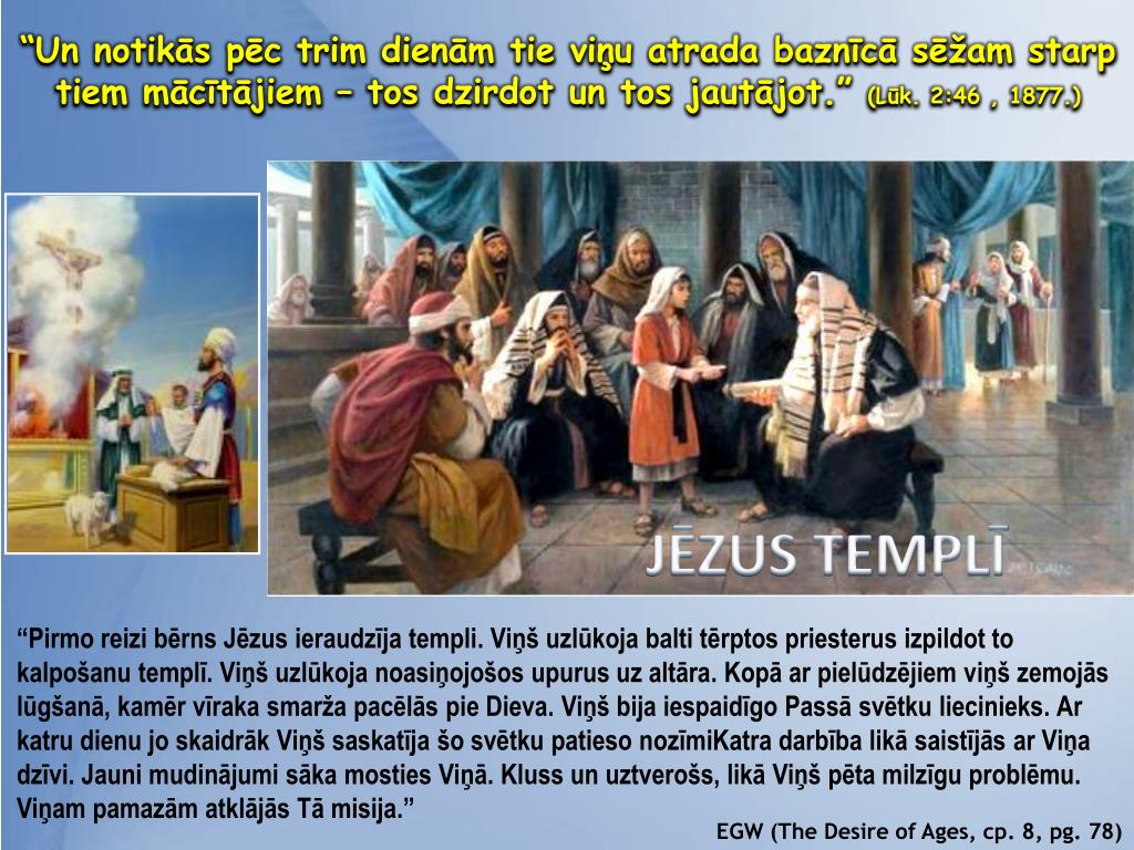 “Un notikās pēc trim dienām tie viņu atrada baznīcā sēžam starp tiem mācītājiem – tos dzirdot un tos jautājot.” (Lūk. 2:46 , 1877.) JĒZUS TEMPLĪ “Pirmo reizi bērns Jēzus ieraudzīja templi. Viņš uzlūkoja balti tērptos priesterus izpildot to kalpošanu templī. Viņš uzlūkoja noasiņojošos upurus uz altāra. Kopā ar pielūdzējiem viņš zemojās lūgšanā, kamēr vīraka smarža pacēlās pie Dieva. Viņš bija iespaidīgo Passā svētku liecinieks. Ar katru dienu jo skaidrāk Viņš saskatīja šo svētku patieso nozīmiKatra darbība likā saistījās ar Viņa dzīvi. Jauni mudinājumi sāka mosties Viņā. Kluss un uztverošs, likā Viņš pēta milzīgu problēmu. Viņam pamazām atklājās Tā misija.” EGW (The Desire of Ages, cp. 8, pg. 78)